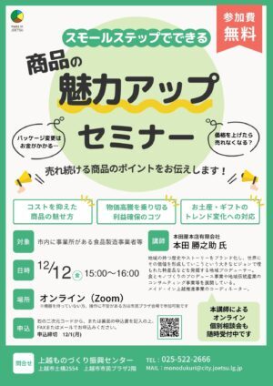 その一環として、メイド・イン上越推進事業のコーディネーターである本田勝之助氏(本田屋本店有限会社代表取締役)をお迎えし、大きなコストをかけずに商品の魅力をアップする方法や、お土産・ギフトのトレンド変化への対応などについてのセミナーを開催します。