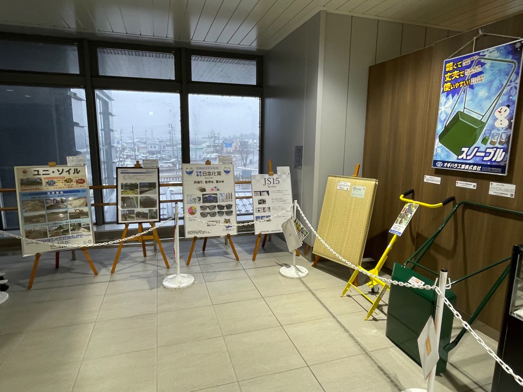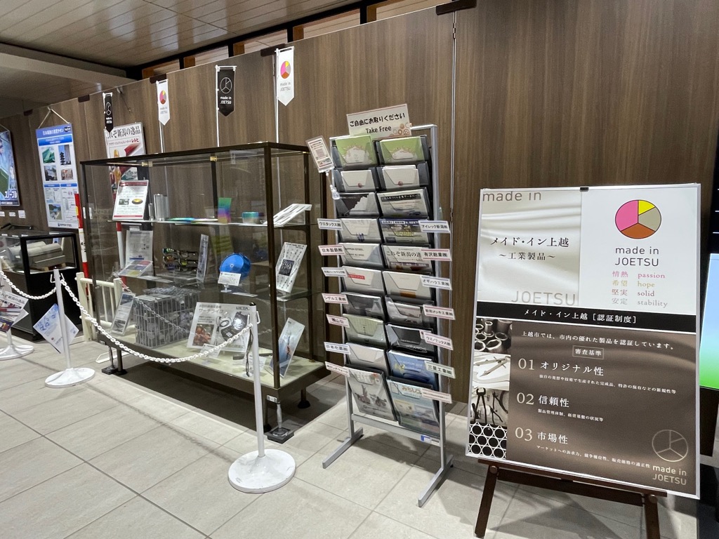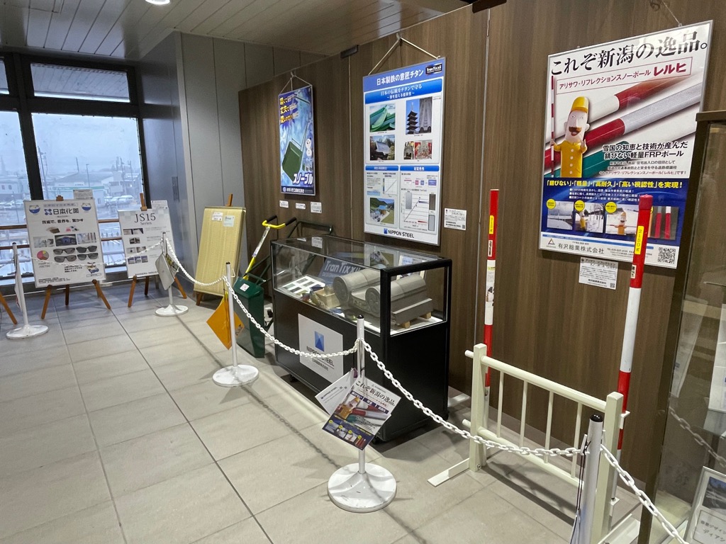 年末年始、上越妙高駅の新幹線改札口前でメイド・イン上越(工業製品)の展示を行っています。
