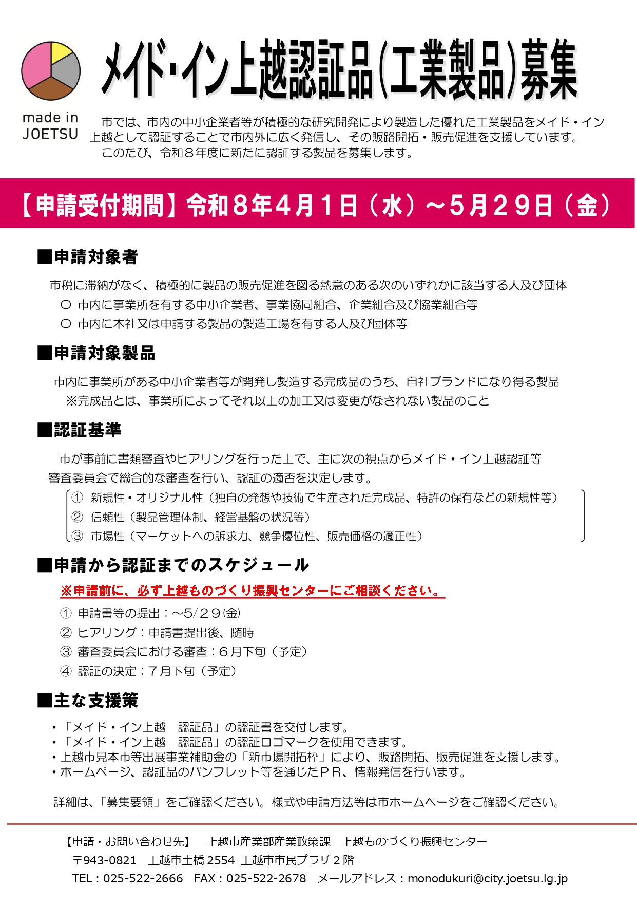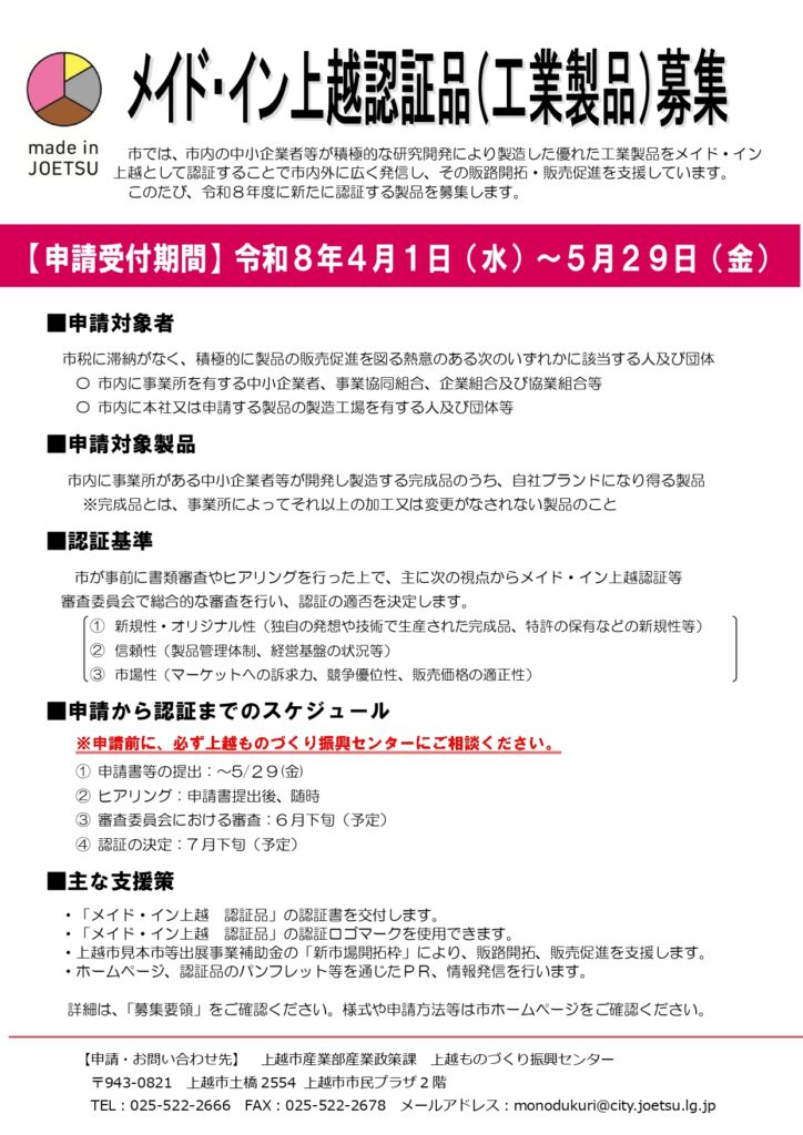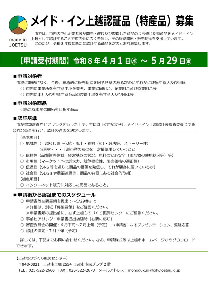 令和8年度「メイド・イン上越」新規認証品の募集を開始しました。