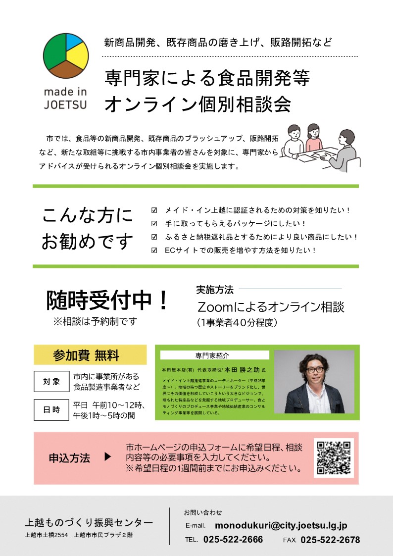 その一環として、メイド・イン上越推進事業のコーディネーターである本田勝之助氏(本田屋本店有限会社代表取締役)をお迎えして、オンライン個別相談会を随時開催します。